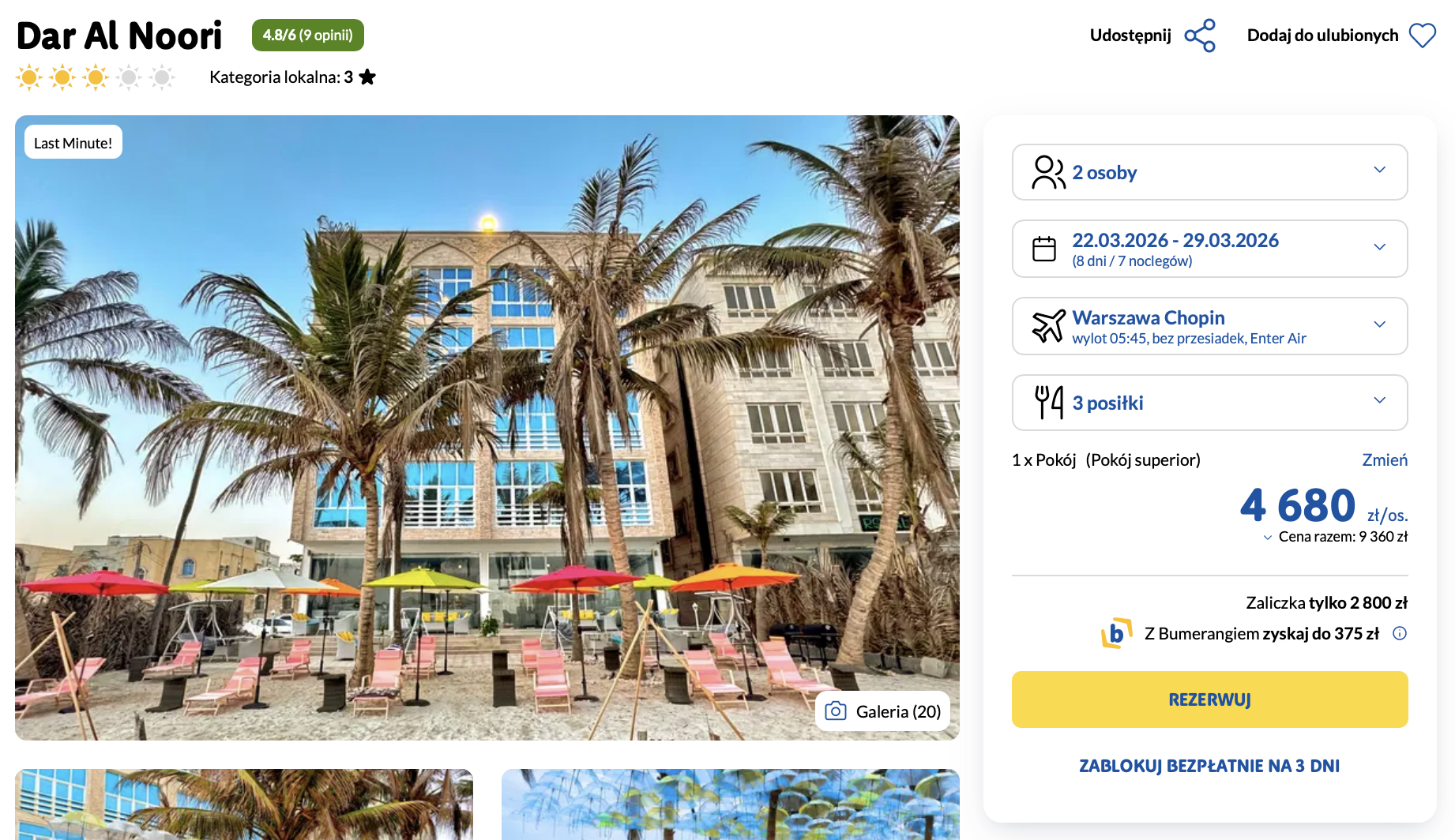 Do Salala polecisz z Warszawy 22 marca. W obie strony podróżować będziesz liniami Enter Air. Lot trwa 7 godzin i 40 minut. W cenie bagaż rejestrowany do 16 kg oraz podręczny do 5 kg na osobę.