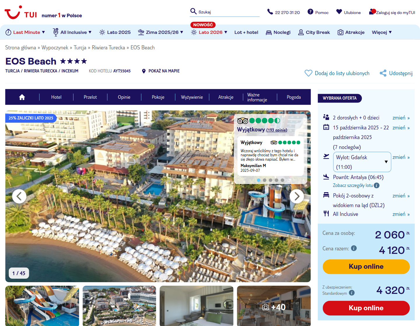 4* hotel EOS Beach został wyremontowany w 2025 roku i położony jest bezpośrednio przy pięknej plaży. Goście chwalą obiekt za doskonałą lokalizację, czystość i przyjazną obsługę. Na terenie hotelu znajduje się aquapark ze zjeżdżalniami, który przypadnie do gustu zarówno dzieciom, jak i dorosłym. Wieczorami hotel organizuje różnorodne atrakcje – od przedstawień i wieczorów karaoke po dyskoteki na plaży i przy basenie.