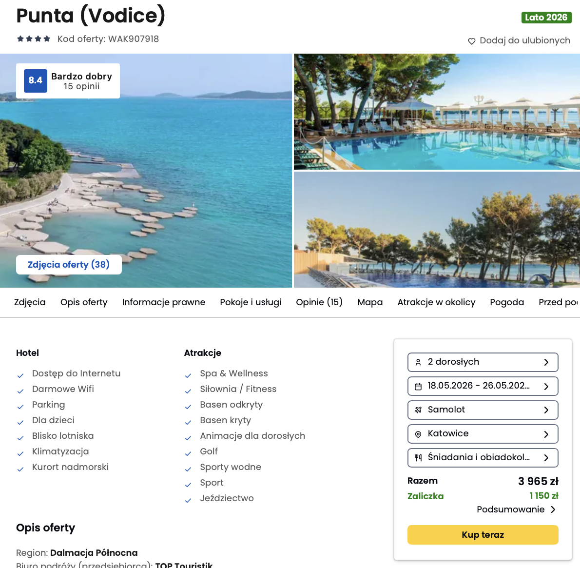Hotel Punta to obiekt, który przeszedł modernizację. Goście chwalą jego doskonałą lokalizację na niewielkim półwyspie, zaledwie 800 metrów od centrum Vodice. Opinie podkreślają przyjazną atmosferę, czysty basen oraz bliskość plaży. Do dyspozycji gości jest basen otwarty i kryty, jacuzzi, strefa wellness z sauną i łaźnią turecką, a także wypożyczalnia sprzętu wodnego. Hotel oferuje także liczne atrakcje sportowe, w tym aqua fitness, badminton i studio fitness. Dla dzieci przygotowano plac zabaw i pokój zabaw.