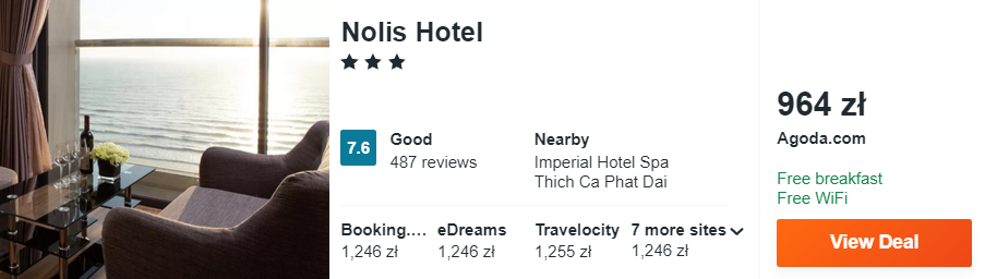 W Vung Tau polecam wam noclegi z codziennymi śniadaniami w dobrym 3* hotelu Nolis, który znajduje się tuż przy plaży Back (Bãi Sau). Na miejscu czekają na was komfortowo urządzone pokoje wyposażone m.in. w klimatyzację, telewizor LCD, zestaw do parzenia kawy lub herbaty oraz minibar. W każdym znajduje się także łazienka z wanną i prysznicem oraz suszarką do włosów. W wolnej chwili będziecie mogli zrelaksować się na dachu, gdzie mieści się odkryty basen oraz taras słoneczny z leżakami.