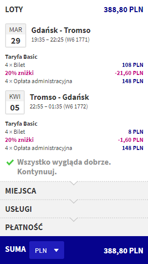 - Loty z Gdańska do Tromso za 388,80 PLN/4 osoby (97,20 PLN/osoba)