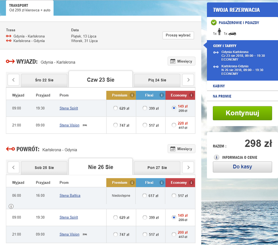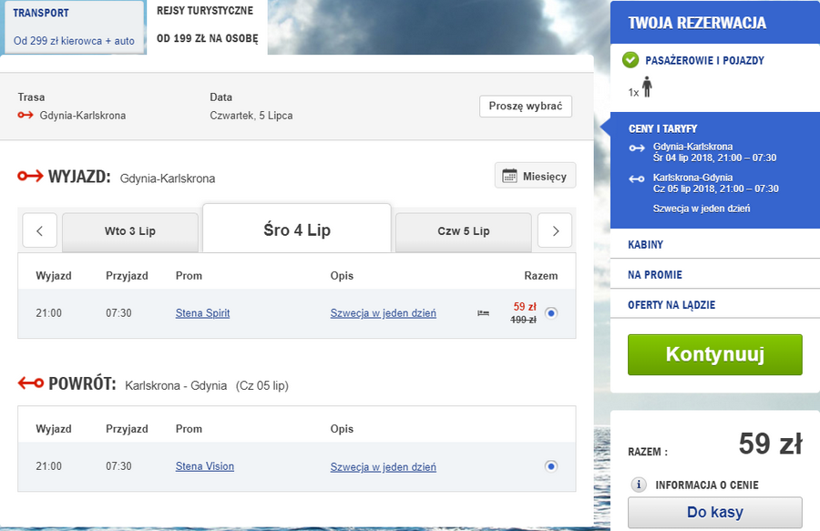 - podróż promem do Szwecji i z powrotem z jednodniowym pobytem w Karlskronie