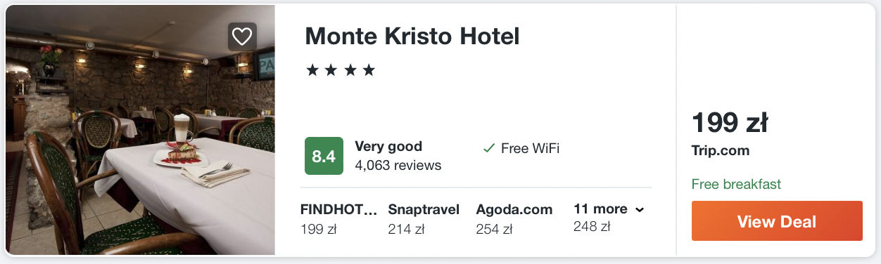 W Rydze polecam zatrzymać się w 4* Monte Kristo Hotel. W cenę zakwaterowania wliczone są śniadania.