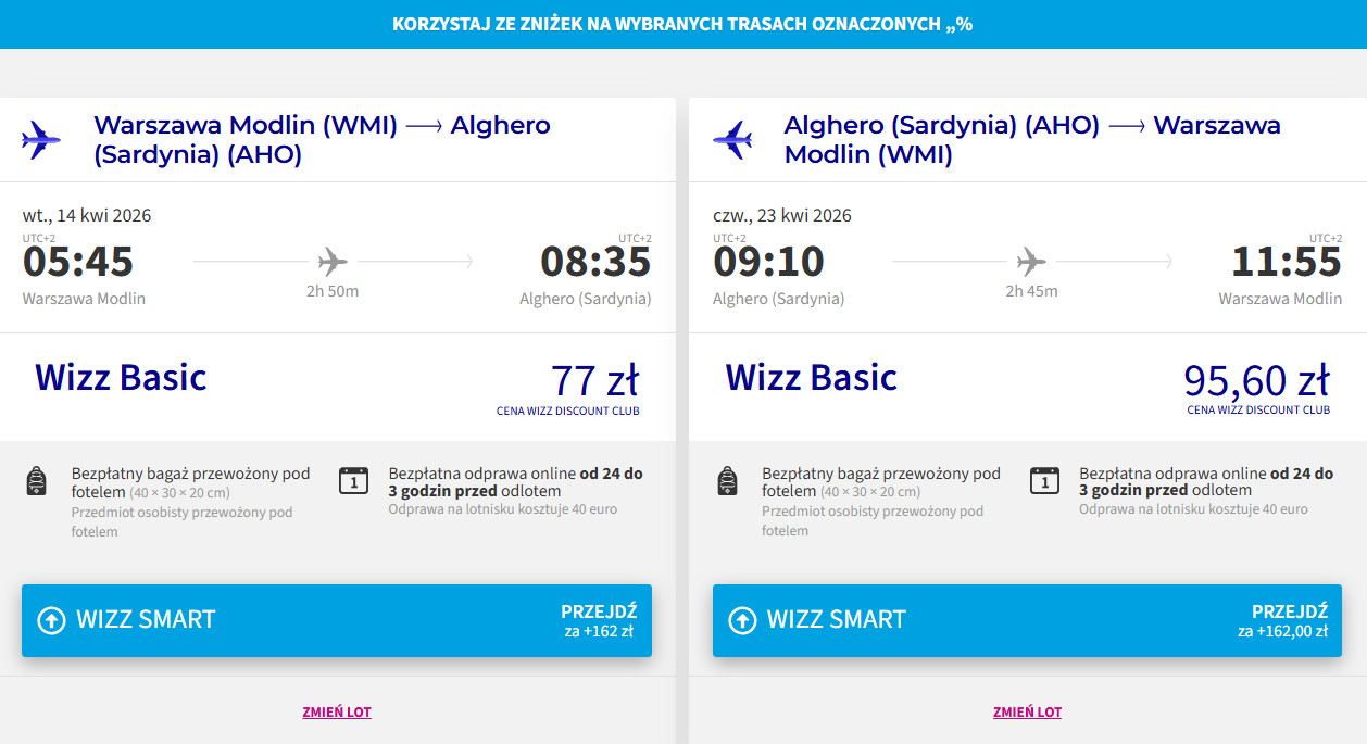 Warszawa Modlin – Alghero – Warszawa Modlin »