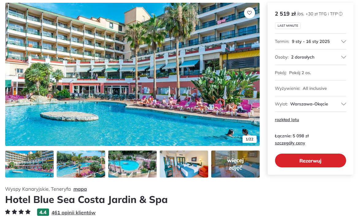 Na Wyspy Kanaryjskie wybierzesz się w terminie 9 – 16 stycznia. Na Teneryfę polecisz Smartwings bezpośrednio z Warszawy lub Wrocławia. W cenę pakietu wliczona jest podróż z bagażem rejestrowanym, podstawowe ubezpieczenie, transfery z lotniska do hotelu i all inclusive.
