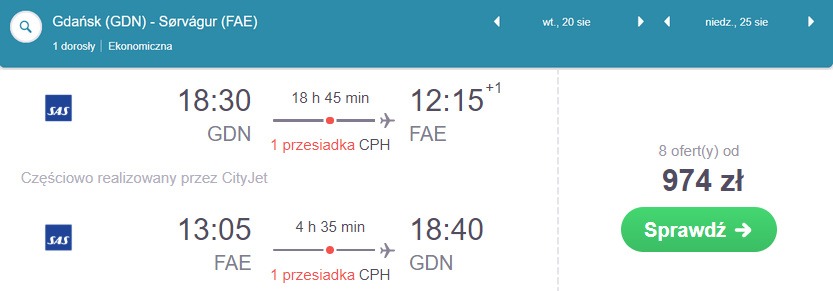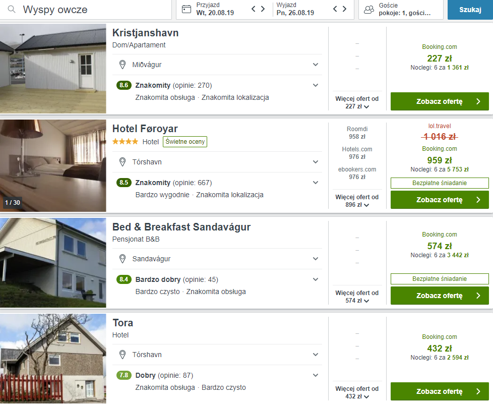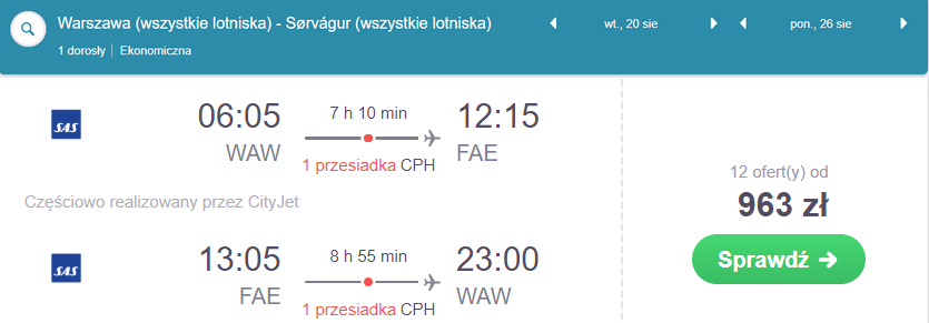 Wybierzcie się w podróż na Wyspy Owcze – wciąż niezadeptane przez masową turystykę. Bilety dostępne są w dobrej cenie w szczycie urlopowym – w sierpniu. To również najlepszy okres podróży w to miejsce, które zdecydowanie przypadnie do gustu miłośnikom przyrody i pięknych krajobrazów. Jeżeli chodzi o noclegi, których propozycję znajdziecie poniżej, to nie należą one do najniższych, ale cena lotów jak również samo miejsce z pewnością to rekompensują.Pod drodze czekają was wygodne przesiadki w Kopenhadze.
