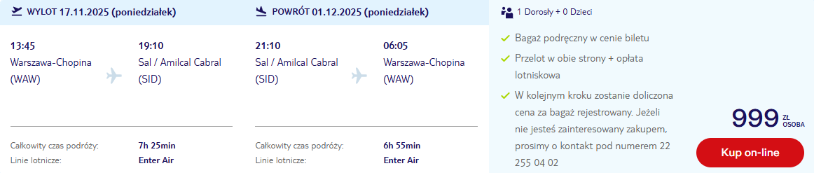 Na Wyspy Zielonego Przylądka polecisz, w terminie 17 listopada – 1 grudnia. Czeka cię podróż z warszawskiego lotniska im. Fryderyka Chopina z Enter Air.