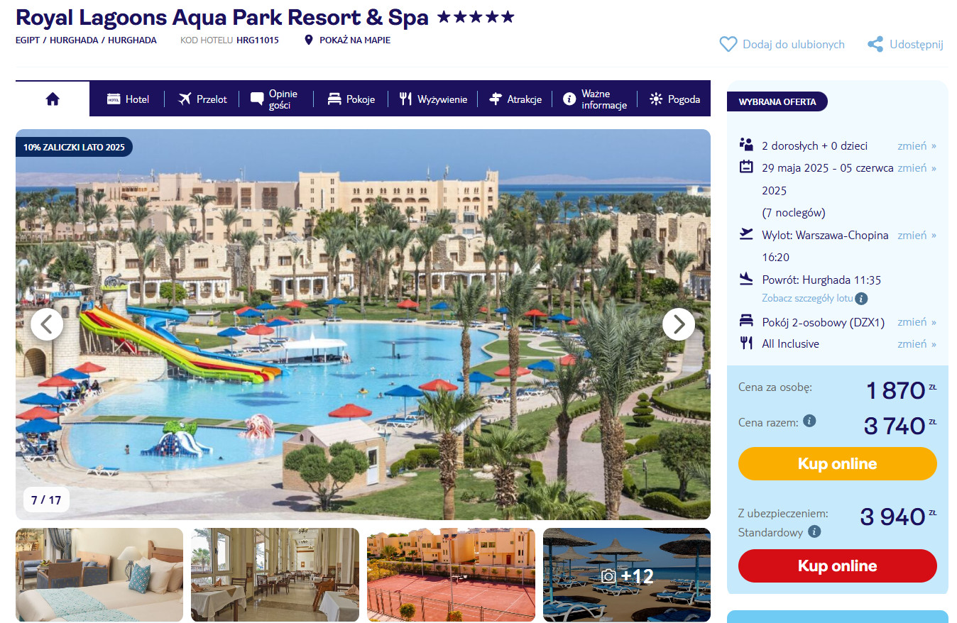 W pakiecie otrzymasz przeloty z bagażem rejestrowanym, podstawowe ubezpieczenie oraz all inclusive. Transfery lotniskowe są dodatkowo płatne (140 PLN/2 osoby).