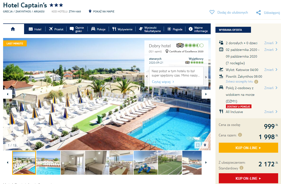 Na Zakintos zatrzymacie się w 3* hotelu Captain’s. Poza zakwaterowaniem w komfortowo urządzonych pokojach z klimatyzacją czeka tam na was odkryty basen, bar, restauracja oraz wyżywienie z all inclusive. Dodatkowo, wybierając ofertę biura podróży TUI będziecie mieli zapewnione transfery lotniskowe oraz opiekę rezydenta na miejscu.