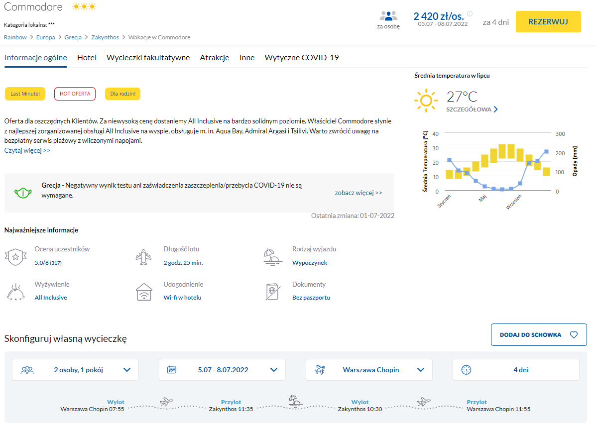 Na grecką wyspę udacie się w terminie 5 – 12 lipca. Czeka was bezpośredni lot na Zakintos z wliczonym bagażem rejestrowanym (nadawanym do luku). Tym razem jako miejsce wylotu możecie wybrać jedno z 4 miast w Polsce: Gdańsk, Katowice, Warszawę oraz Wrocław.