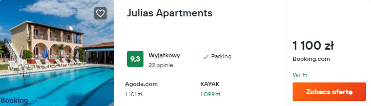 Wybrałem dla was noclegi w świetnie ocenianym pensjonacie Julias Apartments. Do waszej dyspozycji będą tam klimatyzowane wnętrza oraz odkryty basen, a najbliższa plaża znajduje się w odległości krótkiego spaceru od obiektu.