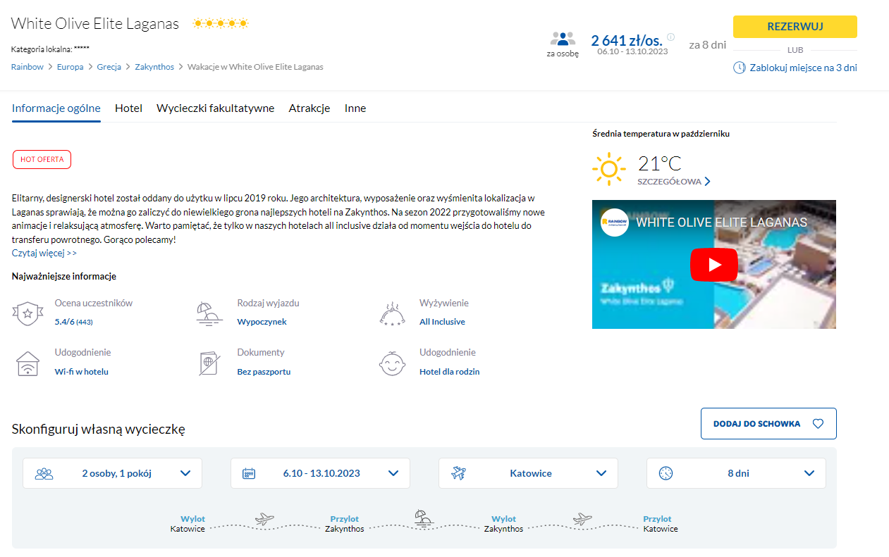 Będziecie zakwaterowani w luksusowym 5* hotelu White Olive Elite Laganas. Ten kameralny, designerski hotel został otwarty w 2019 roku i oferuje najwyższy standard obsługi. Dla gości przygotowano komfortowe pokoje, odkryty basen oraz wieczorne animacje.