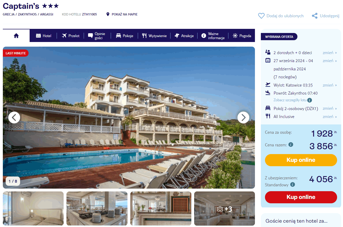Na greckiej wyspie zatrzymasz się w 3* hotelu Captain’s, który znajduje się w odległości 750 metrów od plaży, w miejscowości Argassi. Na terenie obiektu mieści się odkryty basen. Każdy pokój wyposażony jest w klimatyzację, telewizor LCD oraz czajnik elektryczny. W łazience jest prysznic oraz podstawowe przybory toaletowe. Na terenie całego obiektu będziesz miał zapewniony dostęp do sieci WiFi.