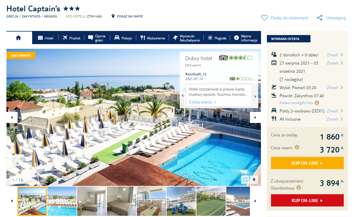 Na Zakintos będziecie zakwaterowani w 3* hotelu Hotel Captain’s. Czekają tam na was komfortowo urządzone klimatyzowane pokoje, odkryty basen oraz oczywiście wyżywienie w formule zróżnicowanego menu w ramach all inclusive!