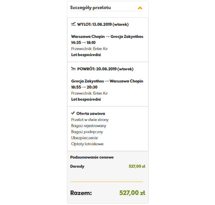 Biuro podróży Neckermann oferuje bezpośrednie przeloty linią Enter Air na Zakintos. Do wyboru macie kilka terminów w sierpniu na tygodniowe lub dwutygodniowe pobyty. Możecie także wybierać pomiędzy wylotami z Warszawy i Katowic. Niezależnie od tego jaką datę podróży wybierzecie to macie jeszcze całkiem sporo czasu (jak na loty czarterowe) na pakowanie i planowanie wyjazdu. W cenę biletów wliczono bagaż rejestrowany.