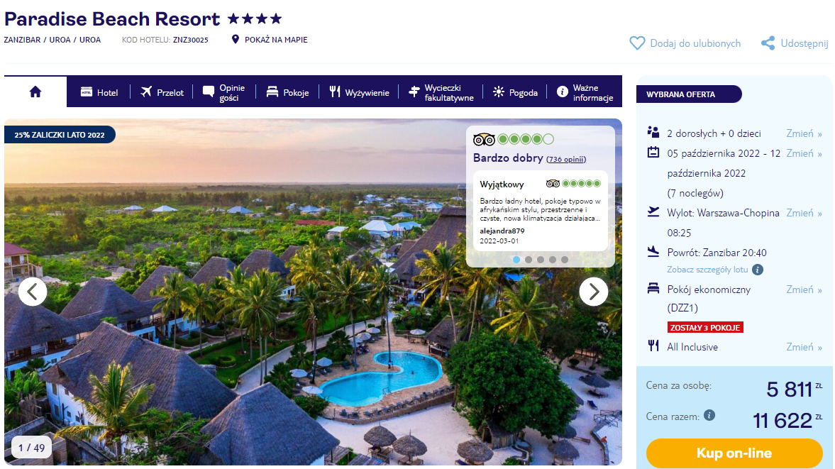Na afrykańską wyspę udacie się w terminie 5 – 12 października. Czeka was bezpośredni lot z Warszawy na Zanzibar, realizowany na pokładzie samolotu linii lotniczej Enter Air. W cenę pakietu wliczono bagaż rejestrowany, a po drodze zaplanowano stop techniczny w Hurghadzie (odbywa się on bez opuszczania samolotu).