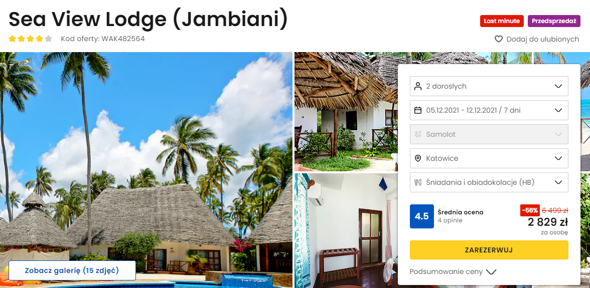 Na Zanzibarze będziecie zakwaterowani w bardzo dobrze ocenianym 4* hotelu Sea View Lodge. Lokalizacja bezpośrednio przy plaży, odkryty basen, klimatyczna aranżacja oraz wliczone w cenę wyżywienie w postaci śniadań i obiadokolacji – oto główne atuty obiektu.