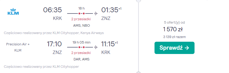 W podróż do Afryki udacie się wiosną, w terminie 13(14) – 22(23) maja. Czekają was loty z warszawskiego lotniska im. Fryderyka Chopina, realizowane na pokładzie samolotów linii lotniczych KLM oraz Kenya Airways. Po drodze zaplanowano bezpieczne, gwarantowane przez przewoźników przesiadki w Amsterdamie, Nairobi oraz Dar es Salaam.
