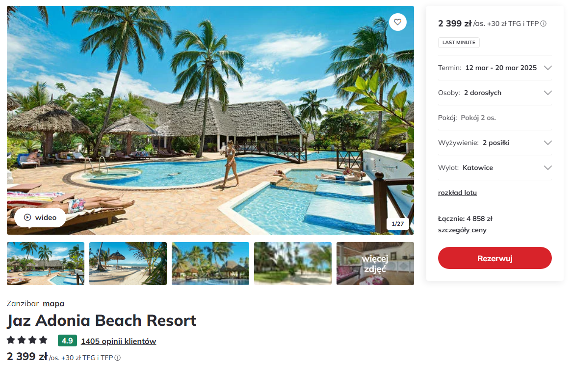 Na Zanzibar wybierzesz się w terminie 12 – 19(20) marca. Do Tanzanii możesz polecieć bezpośrednio (z krótkim przystankiem na tankowanie w Hurghadzie) z lotnisk w Katowicach i Warszawie. W cenę wliczone są loty z bagażem rejestrowanym, podstawowe ubezpieczenie, transfery na trasie lotnisko-hotel-lotnisko oraz śniadania i obiadokolacje.