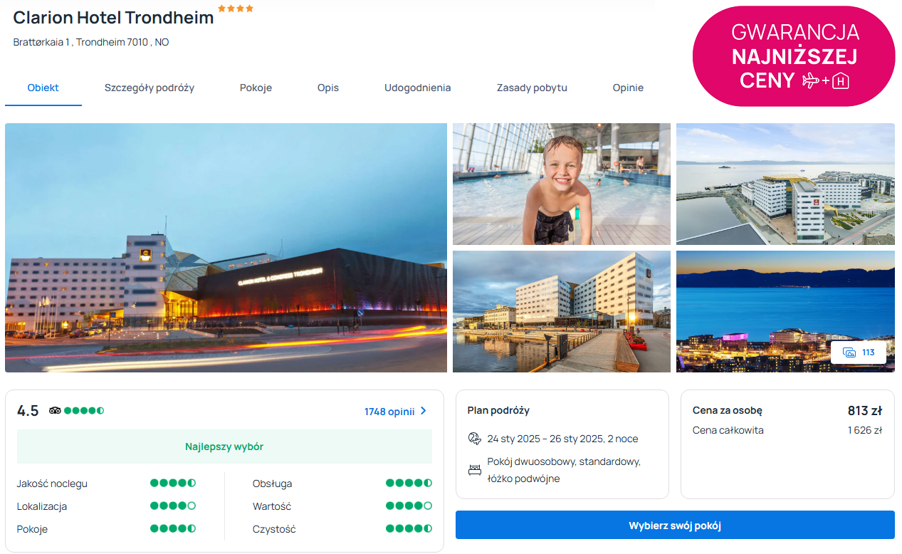 Będziesz zakwaterowany w 4* hotelu Clarion Trondheim. Obiekt oferuje m.in. taras na dachu ze wspaniałym widokiem na pobliską zatokę, kryty basen, elegancko urządzone pokoje oraz śniadania wliczone w cenę pobytu. Nic dziwnego, że cieszy się on świetnymi opiniami dotychczasowych gości.