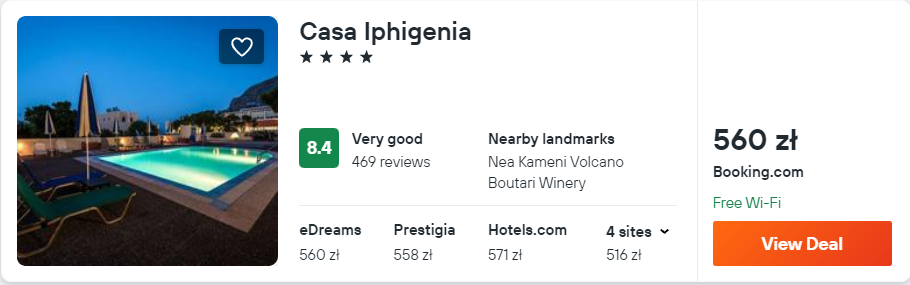 Na Santorynie postaw na 4* hotel Casa Iphigenia. Do twojej dyspozycji zostanie oddany pokój z prywatną łazienką i dostępem do WiFi. Skorzystasz również z basenu zewnętrznego.