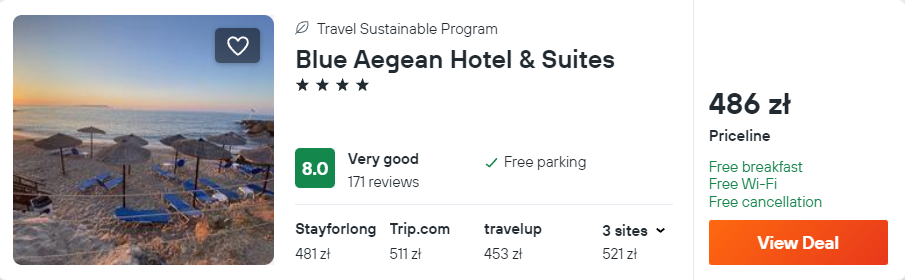 Natomiast na Krecie rekomenduję noclegi w 4* hotelu Blue Aegean. W cenę zakwaterowania wliczono codzienne śniadania.