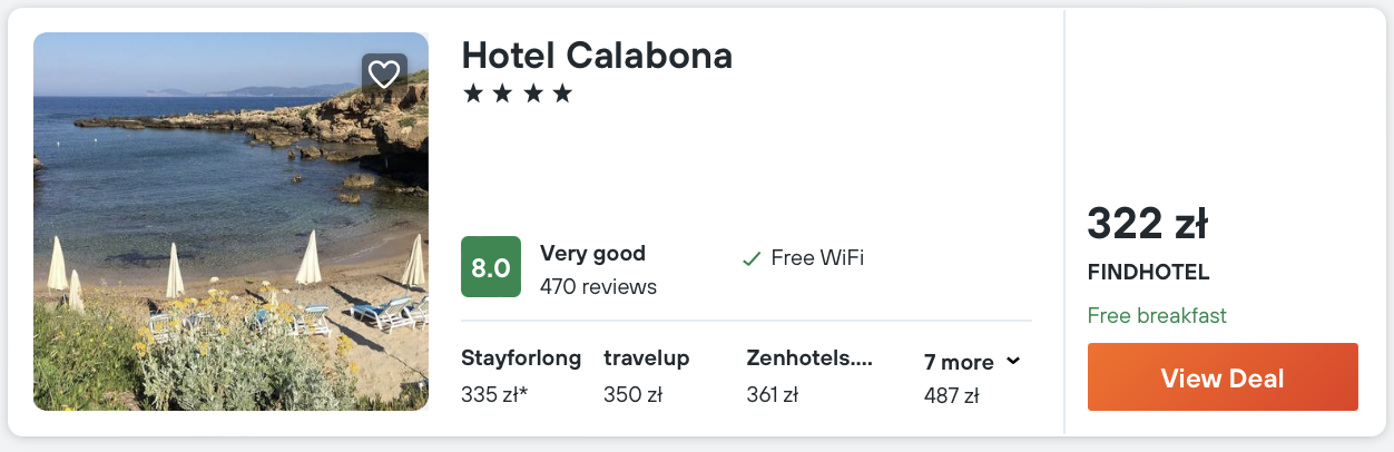 Na Sardynii rekomenduję noclegi w 4* hotelu Calabona. W cenę zakwaterowania wliczone są śniadania.