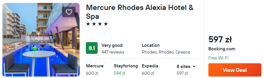 Natomiast na Rodos postaw na 4* hotel Mercure. Do twojej dyspozycji zostanie oddany basen zewnętrzny, taras słoneczny i strefa spa.