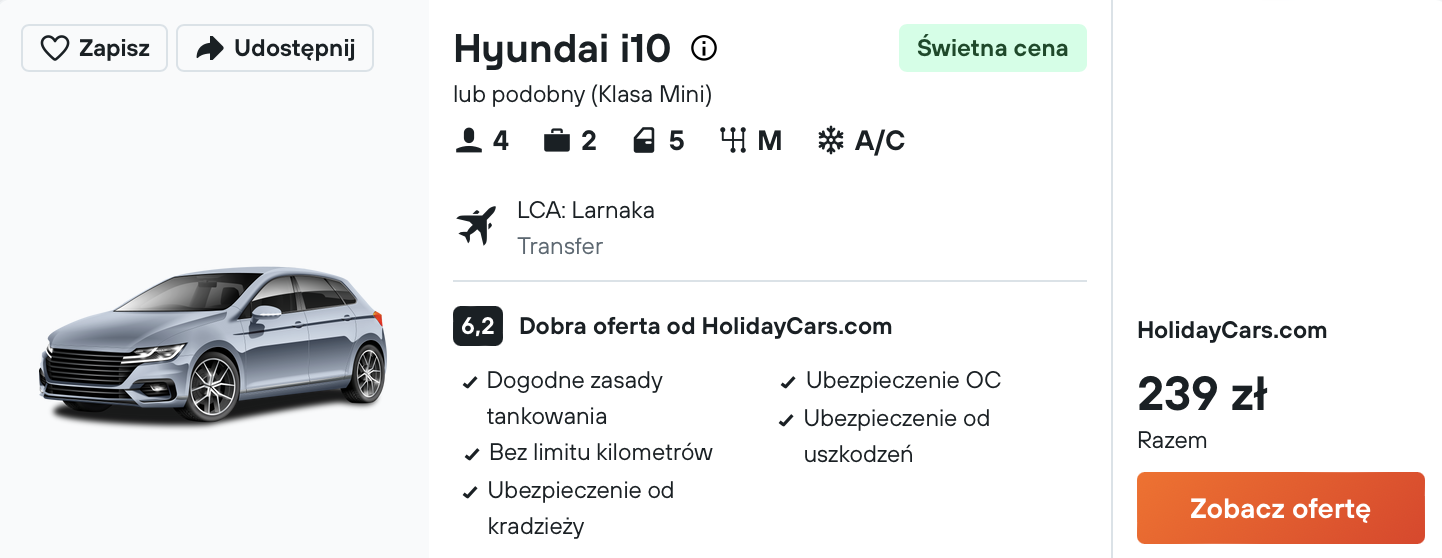Poza wypoczynkiem w hotelowym zaciszu chciałbyś także coś zobaczyć? W takim razie po przylocie do Larnaki wypożycz samochód. Mając do swojej dyspozycji auto, łatwo i wygodnie dojedziesz w różne rejony