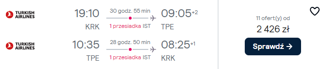 W przypadku każdej podróży czeka cię przesiadka w Stambule. Dłuższą z nich możesz wykorzystać na szybkie zwiedzenie miasta. W cenę wliczony jest bagaż rejestrowany, a najtańsze bilety zarezerwujesz już za 1301 PLN.