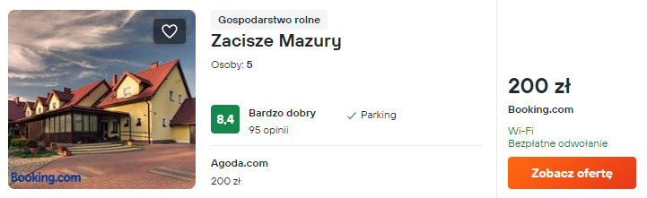 Skorzystaj z przygotowanego przeze mnie zestawienia i udaj się w malownicze okolice mazurskich lasów oraz akwenów wodnych. Poniżej znajdziesz zbiór świetnie ocenianych noclegów. Poszczególne miejsca różnią się od siebie lokalizacją, ceną i standardem. Oznacza to, że każdy łatwo znajdzie coś dla siebie.