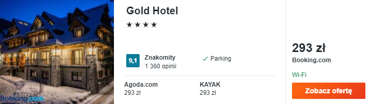 Dowiedzcie się więcej o tym hotelu4* Gold Hotel położony jest w spokojnej części Zakopanego, 300 metrów od wyciągu Nosal oraz niedaleko punktów, w których swój bieg rozpoczyna wiele szlaków. Tradycyjnie zaaranżowane wnętrza oraz nowoczesne udogodnienia, wspaniałe widoki na góry, eleganckie spa oraz restauracja sprawiają, że będzie to doskonałe miejsce na wypoczynek.