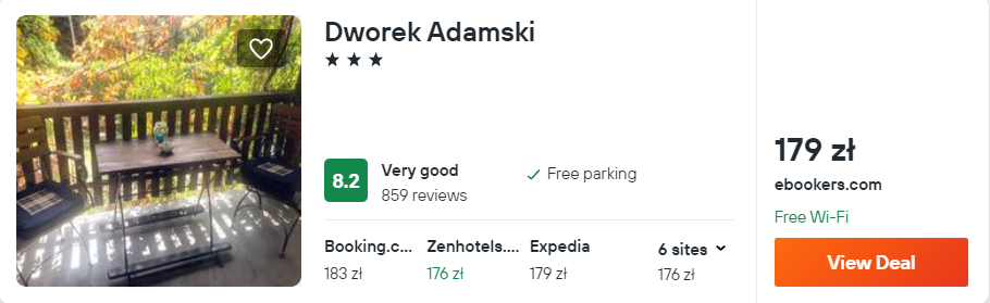 Najtańszym proponowanym przeze mnie obiektem jest 3* Dworek Adamski. Do twojej dyspozycji będzie pokój z prywatną łazienką i dostępem do WiFi.