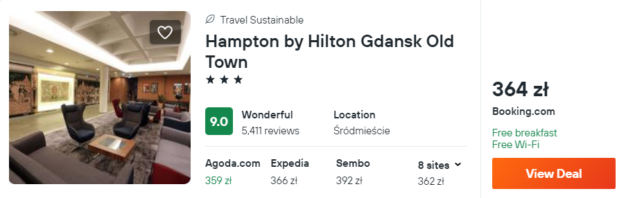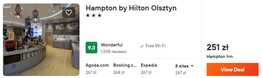 Najtańszym znalezionym przeze mnie obiektem jest 3* hotel Hampton by Hilton w Olsztynie. Będzie to idealna baza wypadowa do odkrywania uroków Mazur.