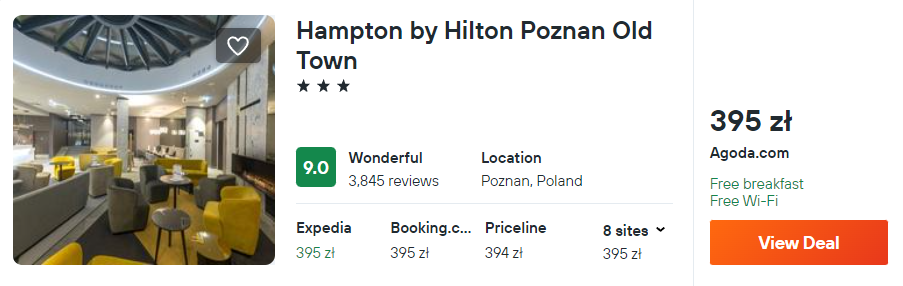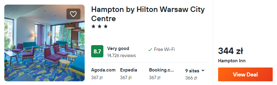 W podobnej cenie dostępny jest 3* Hampton by Hilton zlokalizowany w centrum Warszawy. Twój pokój będzie wyposażony w prywatną łazienkę i komfortowe łóżko.