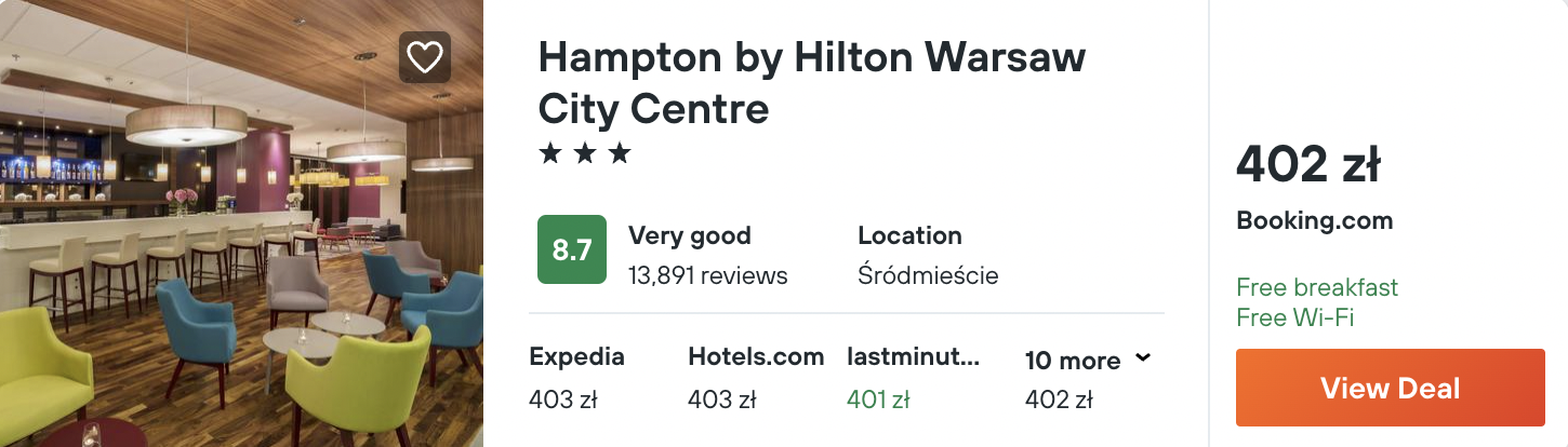 W Warszawie wybierzcie się do 3* Hampton by Hilton, który mieści się w dzielnicy Mokotów. W cenę zakwaterowania wliczono śniadanie. Każdy pokój ma dostęp do Wi-Fi.