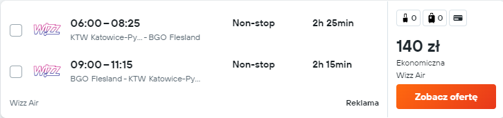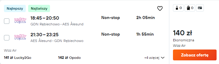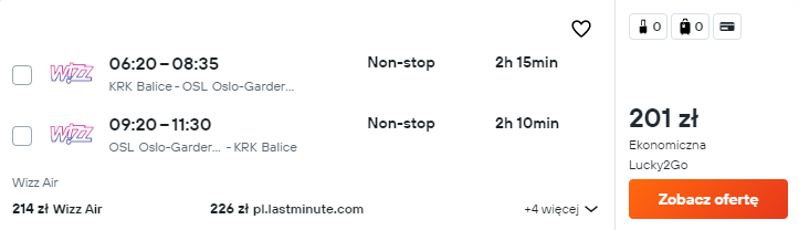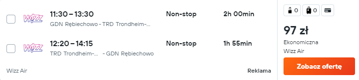 Poniżej znajdziesz wybrane przeze mnie najciekawsze propozycje podróży do Norwegii. Dostępnych jest wiele terminów (w tym na weekend lub majówkę), a najtańsze bilety zarezerwujesz już za 97 PLN. W każdym przypadku czeka cię bezpośredni lot realizowany na pokładzie samolotu linii lotniczej Wizz Air. Bilety dostępne są dla wszystkich – bez żadnych klubów zniżkowych!