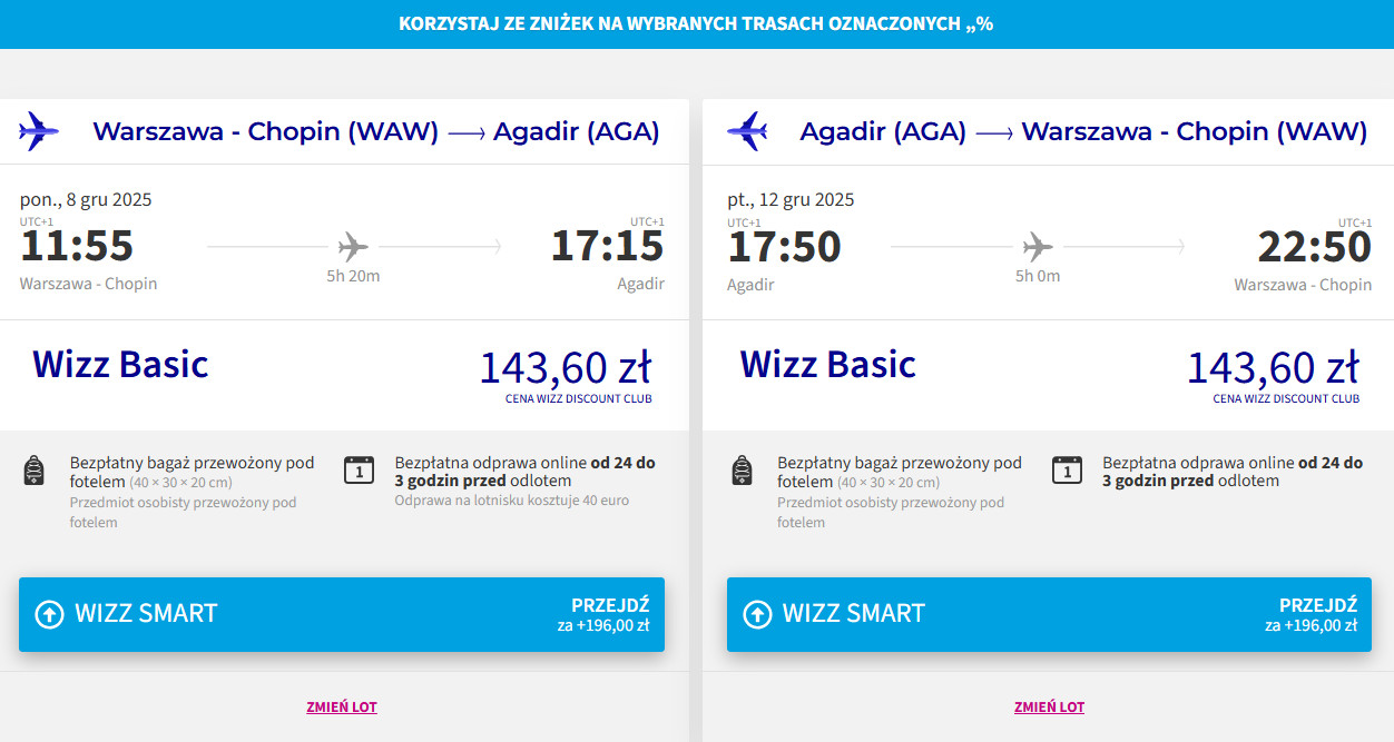 Do Agadiru, Abu Zabi, Barcelony, Marrakeszu, Porto oraz na Islandię (Reykjavik), Maderę, Maltę, Sycylię (Katania) polecisz z Katowic, Warszawy lub warszawskiego lotniska w Modlinie linią Wizz Air z bagażem podręcznym. Bilety w najniższych cenach dostępne są dla osób z Wizz Discount Club. Chętni na loty bez WDC zapłacą więcej – szczegóły poniżej.