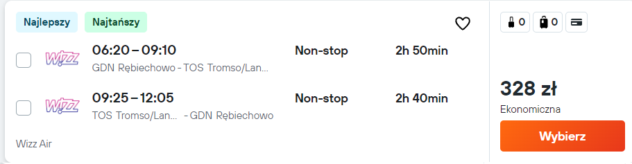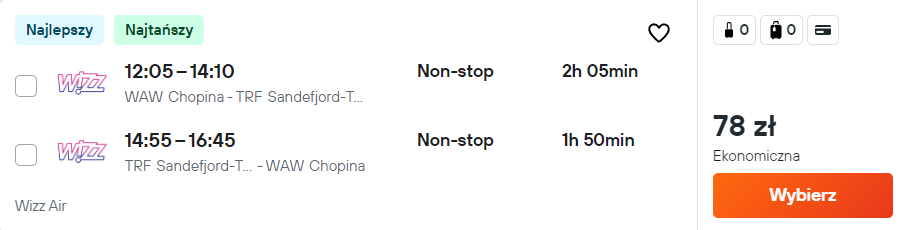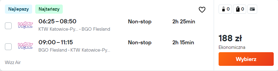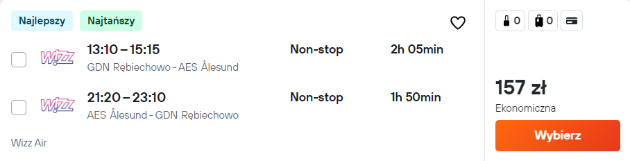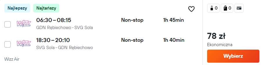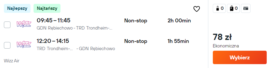Najtańsze bilety zarezerwujesz już za 78 PLN. Są one dostępne dla wszystkich, bez konieczności posiadania klubów zniżkowych. W podróż udasz się na pokładzie samolotu linii lotniczej Wizz Air z małym bagażem podręcznym.