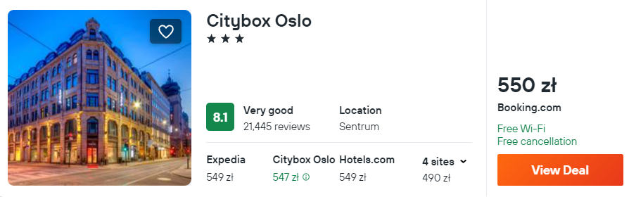 W Oslo polecam 3* hotel Citybox. Obiekt mieści się w centrum miasta i jest bardzo dobrze oceniany przez dotychczasowych gości.