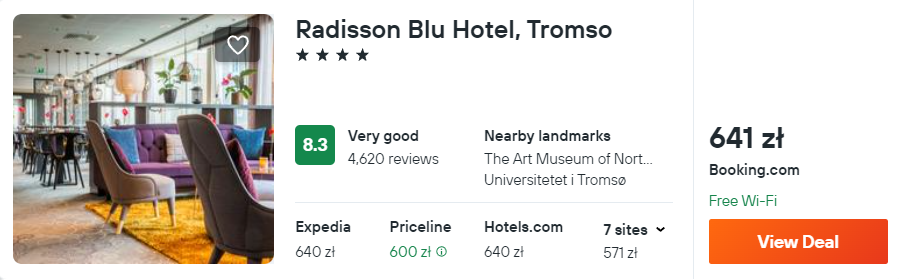 W Tromso rekomenduję 4* hotel Radisson Blu. Do twojej dyspozycji zostanie oddany pokój z prywatną łazienką i dostępem do WiFi.