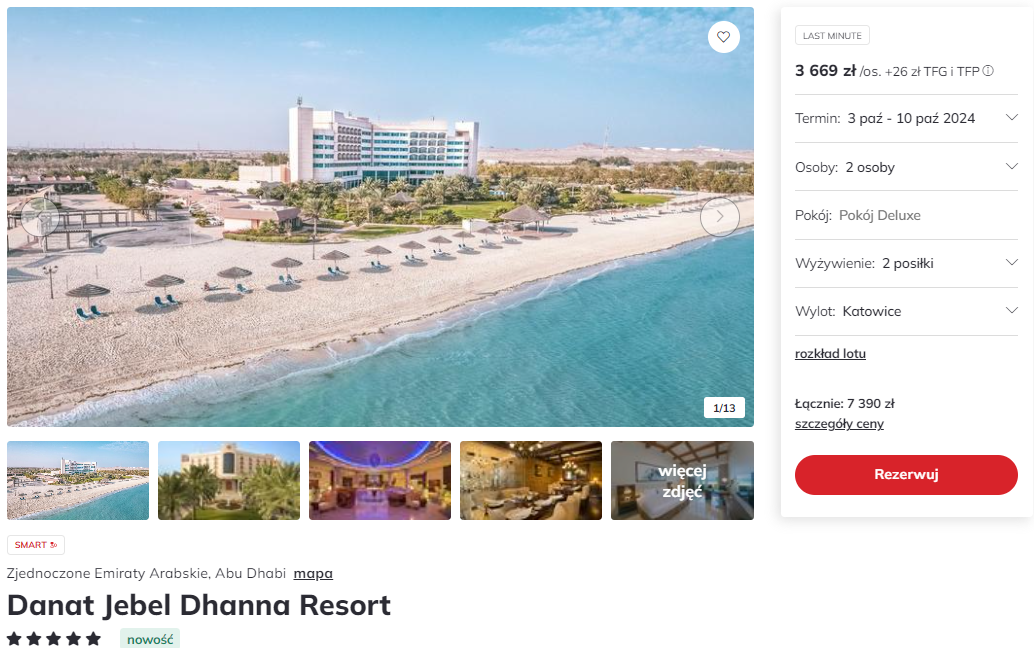 Nad Zatoką Perską zatrzymasz się w bardzo dobrym 5* hotelu Danat Jebel Dhanna Resort, który znajduje się tuż przy plaży (bezpłatne parasole i leżaki). Na terenie obiektu mieszczą się trzy odkryte baseny, centrum fitness oraz sala zabaw dla najmłodszych. Każdy pokój został wyposażony w klimatyzację, telewizor LCD, minibar oraz czajnik elektryczny. W łazience jest wanna, suszarka do włosów, a dla gości przygotowano podstawowe przybory toaletowe.