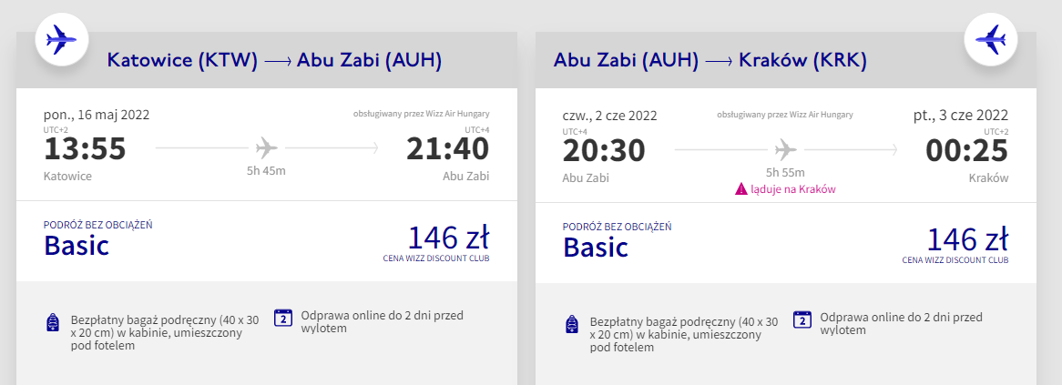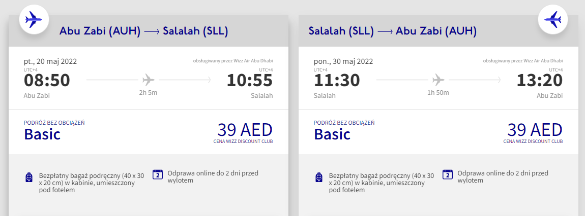 W podróż na Półwysep Arabski wybierzecie się na przełomie maja i czerwca. Bilety w tytułowej cenie kupicie dokonując dwóch oddzielnych rezerwacji: najpierw na przeloty pomiędzy Katowicami, a Abu Zabi, a następnie między Abu Zabi i Omanem.