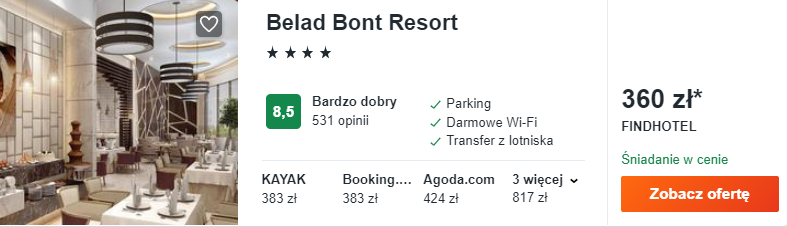 W Omanie rekomenduję wam zatrzymać się w 4* hotelu Belad Bont Resort. Na miejscu czekają nowocześnie urządzone, stylowe wnętrza, komfortowo urządzone pokoje oraz śniadania wliczone w cenę zakwaterowania.