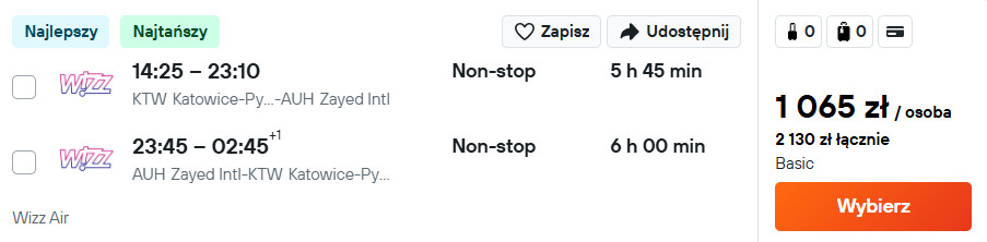 Wyjazd rozpoczniesz i zakończysz na lotnisku w Katowicach. Do Abu Zabi udasz się w terminie 14-22 (23) grudnia. W obie strony polecisz linią Wizz Air z bagażem podręcznym. Bilety w najniższej cenie dostępne są dla wszystkich chętnych. Do ich zakupu nie potrzebujesz żadnych klubów zniżkowych!