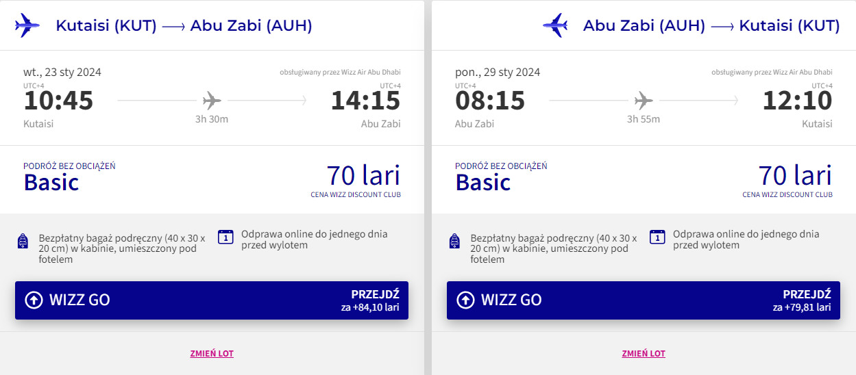 Drugim etapem jest lot z Gruzji do Zjednoczonych Emiratów Arabskich i z powrotem. Wszystkie przeloty odbędziesz na pokładach samolotów linii Wizz Air z wliczonym małym bagażem podręcznym. Bilety w najniższej cenie dostępne są dla członków Wizz Discount Club. Chętni na loty bez WDC zapłacą więcej.