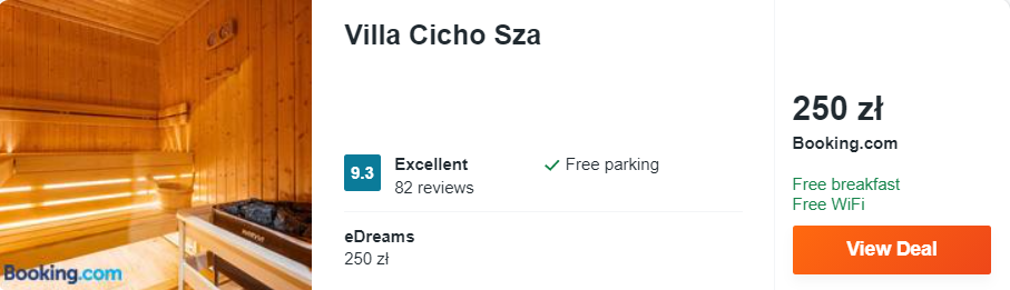 Dowiedzcie się więcej o tym hoteluOstatnim obiektem w przygotowanym przeze mnie zbiorze jest Villa Cicho Sza, która zapewnia zakwaterowanie w dwuosobowych pokojach z codziennymi śniadaniami. Obiekt znajduje się w Czarnej Górze, a w jego okolicy panują dogodne warunki dla miłośników różnych form aktywnego wypoczynku, w tym narciarstwa.