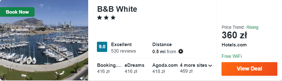 Na Sycylii zakwaterowani będziecie w ścisłym centrum Palermo w 3* hotelu B&B White. Z lotniska do miejsca zakwaterowania dojedziecie autobusem lub pociągiem.