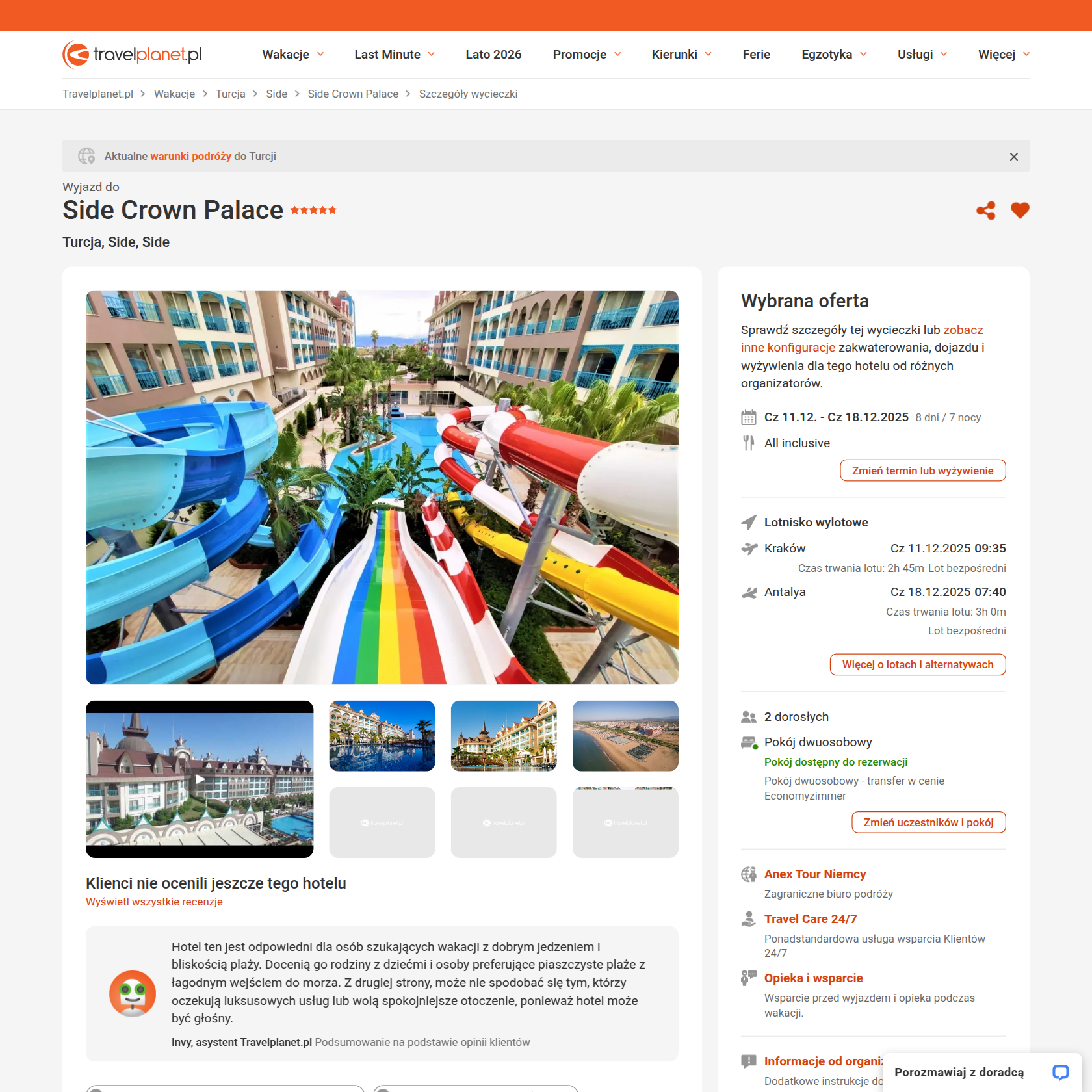 Na miejscu zatrzymasz się w luksusowym 5* hotelu Side Crown Palace położonym w regionie Evrenseki, zaledwie 400 metrów od plaży. Hotel otrzymuje bardzo pozytywne opinie gości, którzy szczególnie chwalą przestronne i dobrze wyposażone pokoje, smaczne i urozmaicone wyżywienie oraz nowoczesne wnętrza. Na terenie obiektu znajdują się baseny z atrakcjami wodnymi, w tym zjeżdżalnie, a także strefa wellness ze spa, sauną i łaźnią turecką.