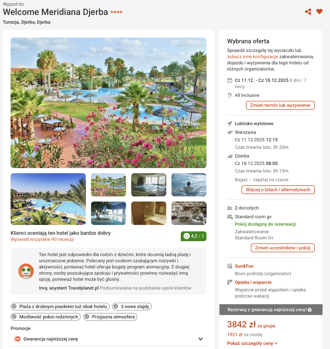 Na miejscu czeka na ciebie 4* hotel Welcome Meridiana Djerba, położony bezpośrednio przy piaszczystej plaży. Obiekt oferuje basen zewnętrzny, kryty basen podgrzewany w sezonie zimowym, a także zjeżdżalnie (czynne w sezonie letnim). Goście chwalą przede wszystkim doskonałą lokalizację, przyjazną atmosferę oraz smaczne i urozmaicone posiłki serwowane w formie bufetu.
